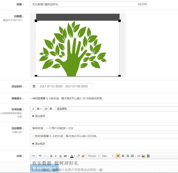 编辑对应的内容,设置好活动时间,奖项等信息点击【保存植树活动】即可。
